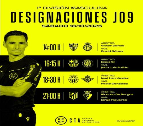 西甲第九轮部分裁判选派: