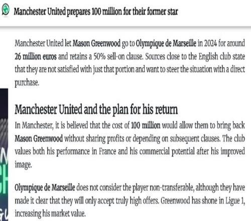 西班牙「Fichajes转会网」很快曝料称,曼联准备豪掷1亿欧元(8680万英镑)向马赛回购格林伍德。据其所言,曼联出售青木的合同中有50%的转售条款,但俱乐部不满足于只分成,希望重新拥有这位天才前锋。