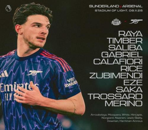 阿森纳客战桑德兰:扎卡战旧主,萨卡、埃泽、梅里诺首发