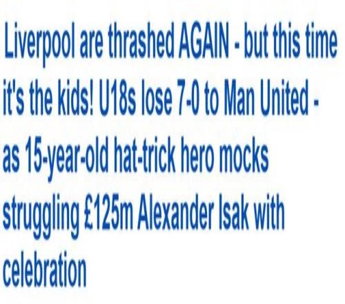 曼联青年队70利物浦,小梅西戴帽!戏耍4人后破门庆祝嘲讽伊萨克