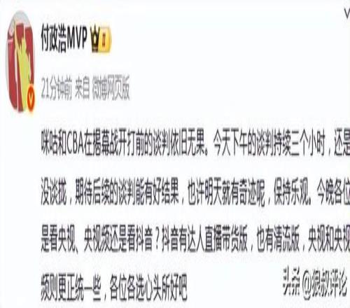 此前,由于咪咕和CBA官方谈判尚未达成一致,咪咕官方公开致信球迷:CBA常规赛开赛在即 很遗憾暂未获得新赛季转播权。