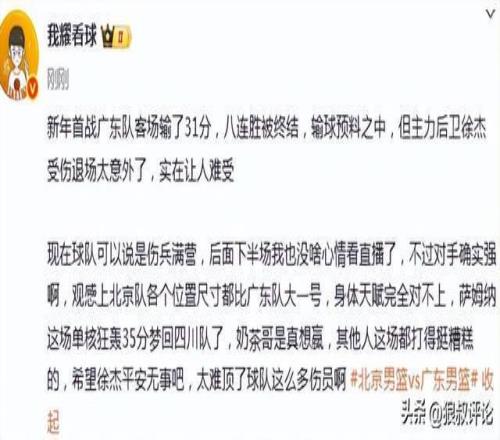 广东31分惨负北京被终结8连胜引热议徐杰伤情未定曾凡博强势回归
