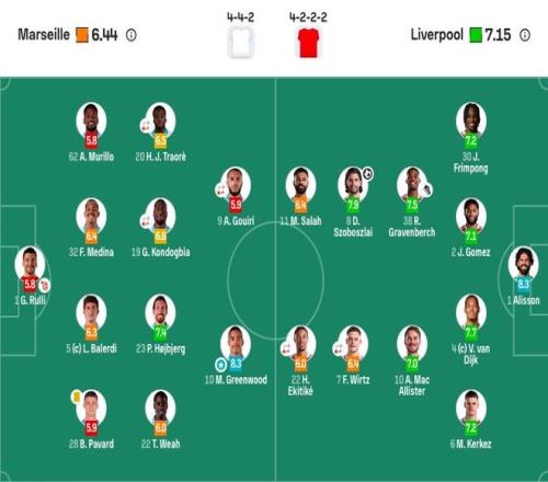 马赛首发:1-鲁利、28-帕瓦尔、5-巴列尔迪、32-梅迪纳、62-穆里略、19-孔多比亚(67'14-派尚)、23-霍伊别尔、9-古伊里(67'97-奥巴梅扬)、10-格林伍德、22-维阿、20-H·特拉奥雷(67'26-纳迪尔)