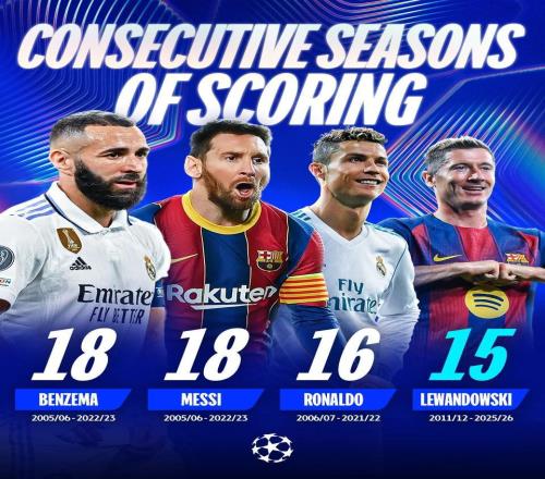 莱万已连续15个赛季欧冠进球,仅次于本泽马、梅西和C罗