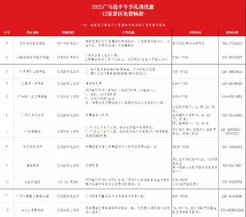 免费参观景区清单(活动解释权以各景区说明为准)。表格来自广州马拉松赛组委会